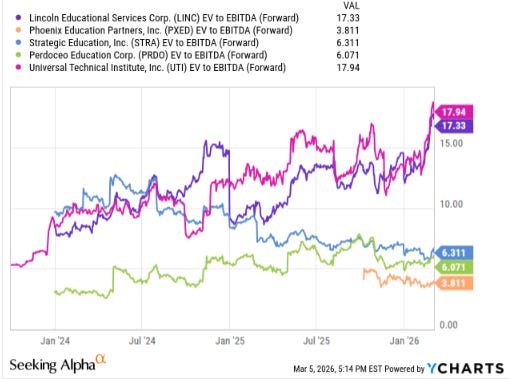 Since January 2025, Lincoln’s valuation multiple has expanded dramatically — nearly doubling — while Strategic Education’s multiple has compressed. The result is the striking divergence in valuation multiples visible in the chart above.